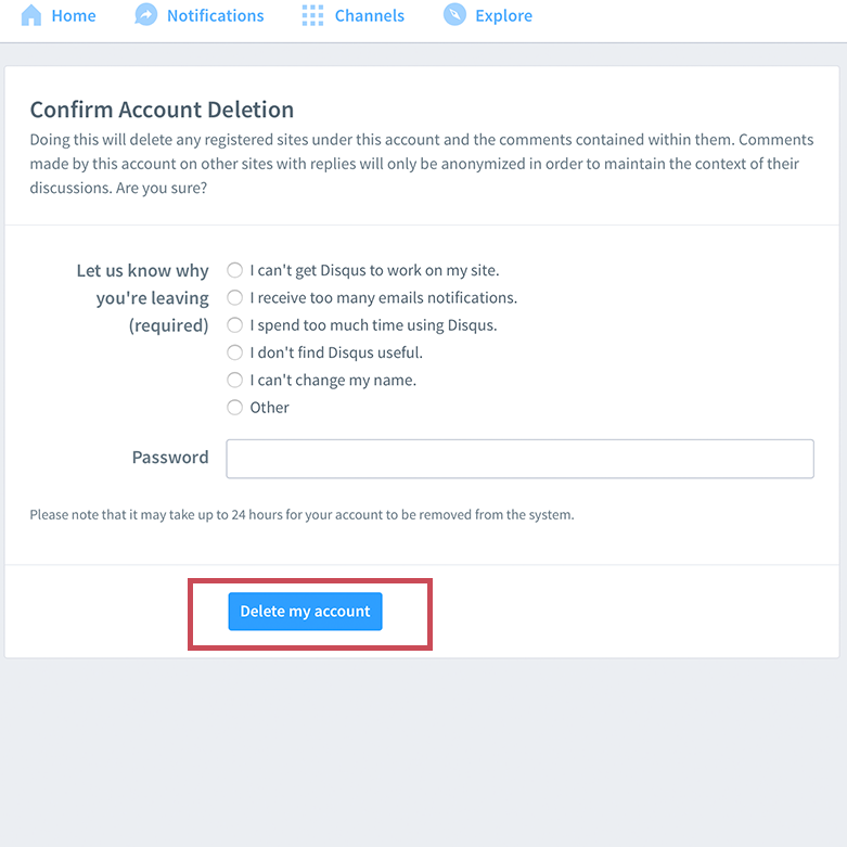 Let us know why you’re leaving (required)[なぜあなたがやめるのか教えてください(必須)]は一番上の I can’t get Disqus to work on my site.(自分のサイトで使わなくなった)をチェックすればよいです。
